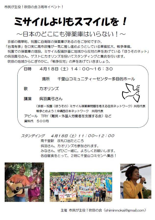 ●ミサイルよりもスマイルを! ~日本のどこにも弾薬庫はいらない~ 14:00~16:30 場所:千里山コミュニティーセンター多目的ホール 歌:カオリンズ 講演:呉羽真弓さん アピール:TRYなど 資料代:500円 主催:市民が主役!吹田の会 |
