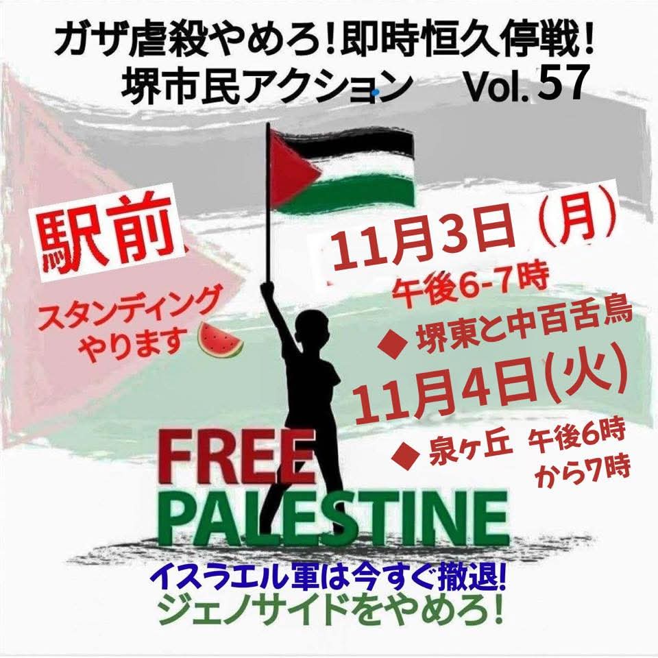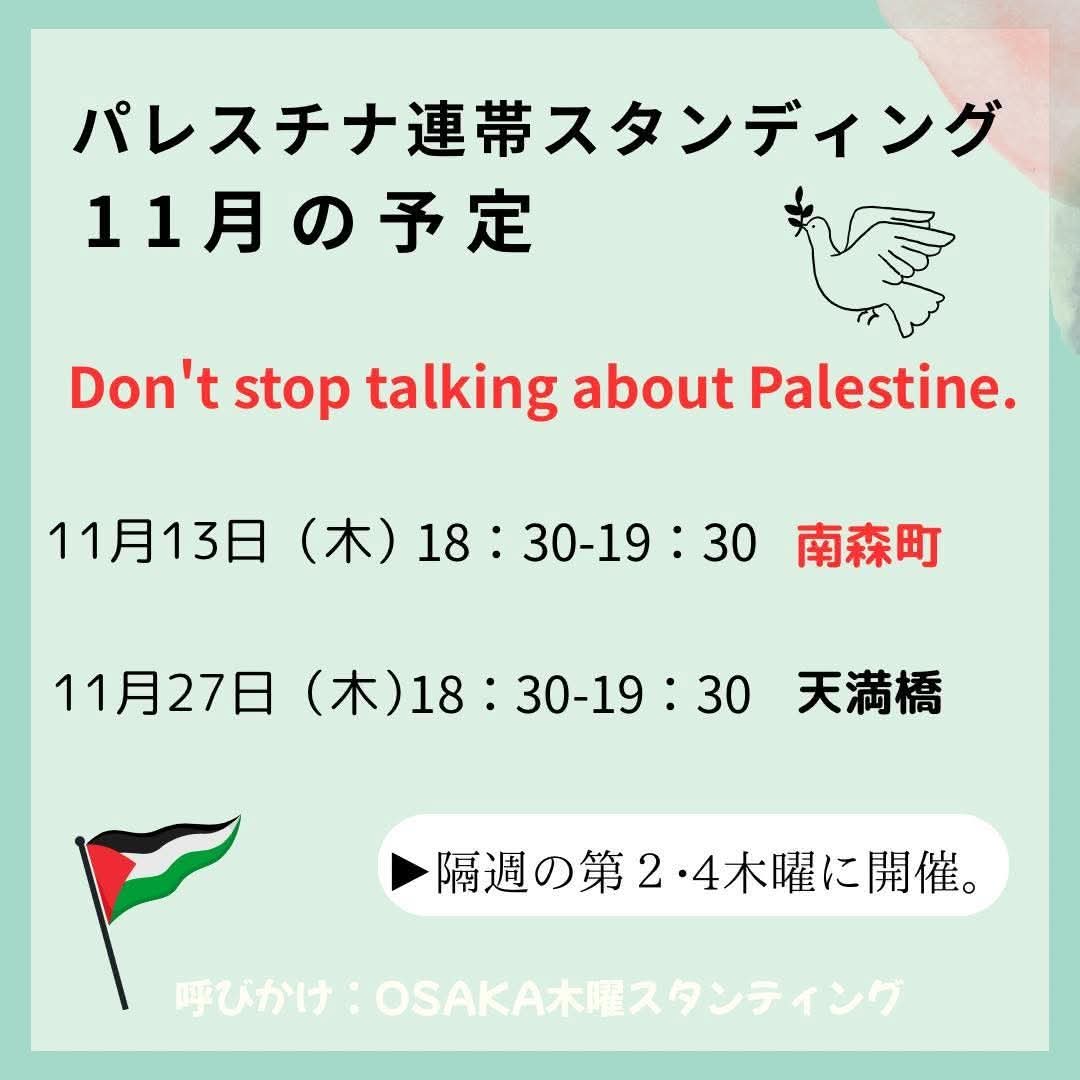 9:00-17:00 場所:日本基督教団 東梅田教会 2階 201号室 入場無料 主催:同実行委員会 ●パレスチナ連帯スタンディング 18:30ー19:30 南森町 呼びかけ:OSAKA木曜スタンディング |
