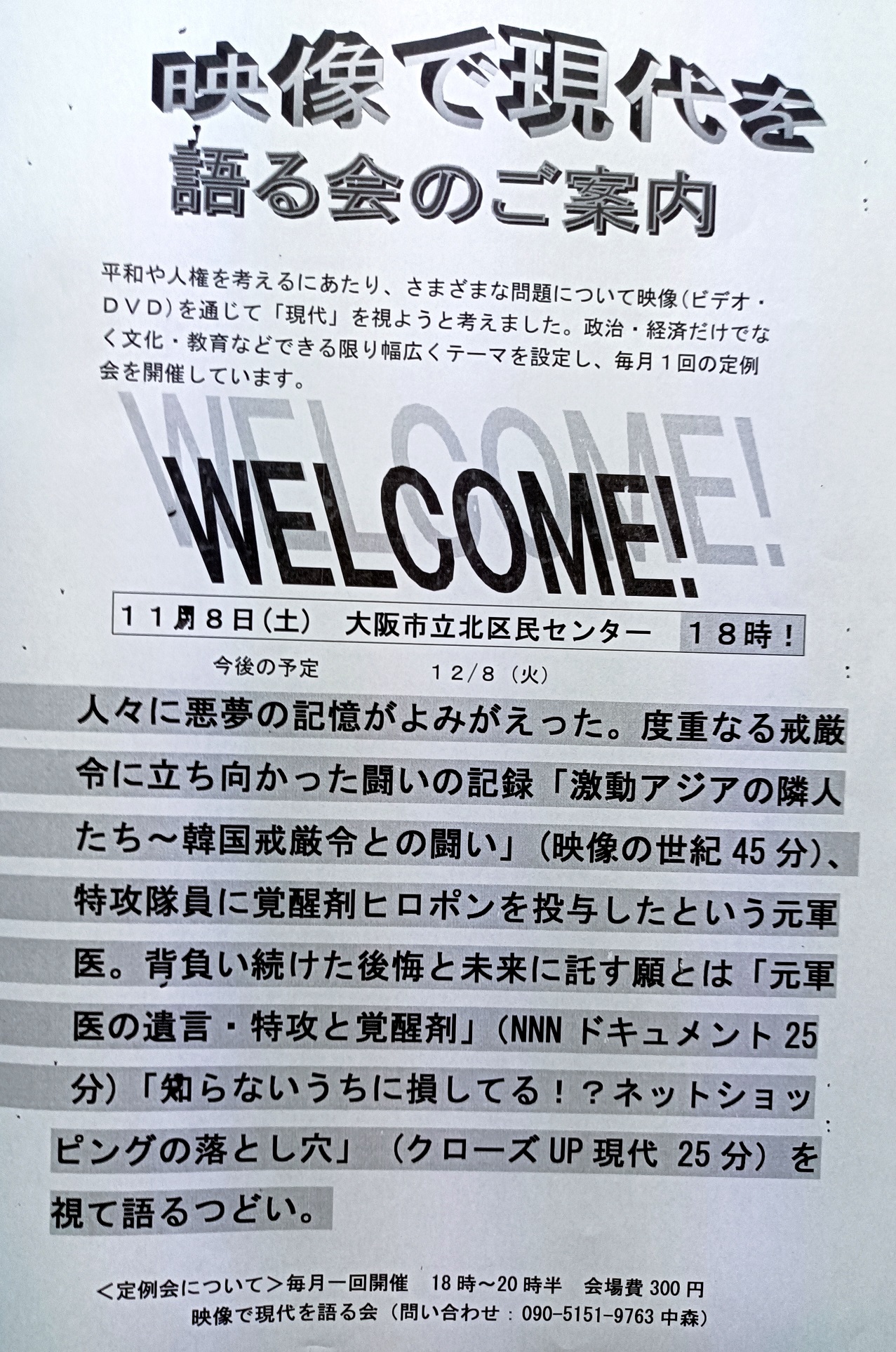 13:00〜17:00 場所:大東野崎人権文化センター 内容:香港デモの映画をみて、香港人・韓国人のレクチャーを聞き、みなで地球グローバル時代の民主主義について考える 参加費:投げ銭 主催:地球人連合 ●ドキュメンタリーを視て語るつどい 18時~ 大阪市立北区民センター(JR天満駅) 「激動アジアの隣人たち〜韓国戒厳令との闘い」、「元軍人の遺言・特攻と覚醒剤」、「知らないうちに損してる!?ネットショッピングの落とし穴」を上映 会場費:300円 映像で現代を語る会 ●アイヌ民族連帯!関西集会 14時~17時 会場:大阪国労会館(JR天満駅) 講演:宇佐照代さん(アイヌ文化継承者)のお話、ムックリ演奏など 三木ひかるさん(ピリカ全国実会員)の問題提起「アイヌ民族遺骨問題と北海道大学―その150年」 参加費:1000円 主催:ピリカ全国実・関西 ●私はここだ!大阪公演 18:30開演(開場18:00) クレオ大阪東ホール チケット前売 高校生以下 500円 学生・障がい者・非正規 1000円 一般2000円 当日料金はそれぞれ500円UP 主催:大阪公演実行委員会 ●森友事件は未解決!怒りのデモ 第93回 午前11時集会 野田中央第2公園 11時40分 デモ出発 主催:「森友学園疑獄」を許すな!実行委員会 ●被爆80年 今こそ核兵器なくそう 市民のつどい 午後2時半~4時半(開場午後2時)高槻市立生涯学習センター多目的ホール 講演:『核兵器も戦争もない世界を』直野 章子さん 京都大学人文科学研究所教授 協力金:500円 主催:同実行委員会 |