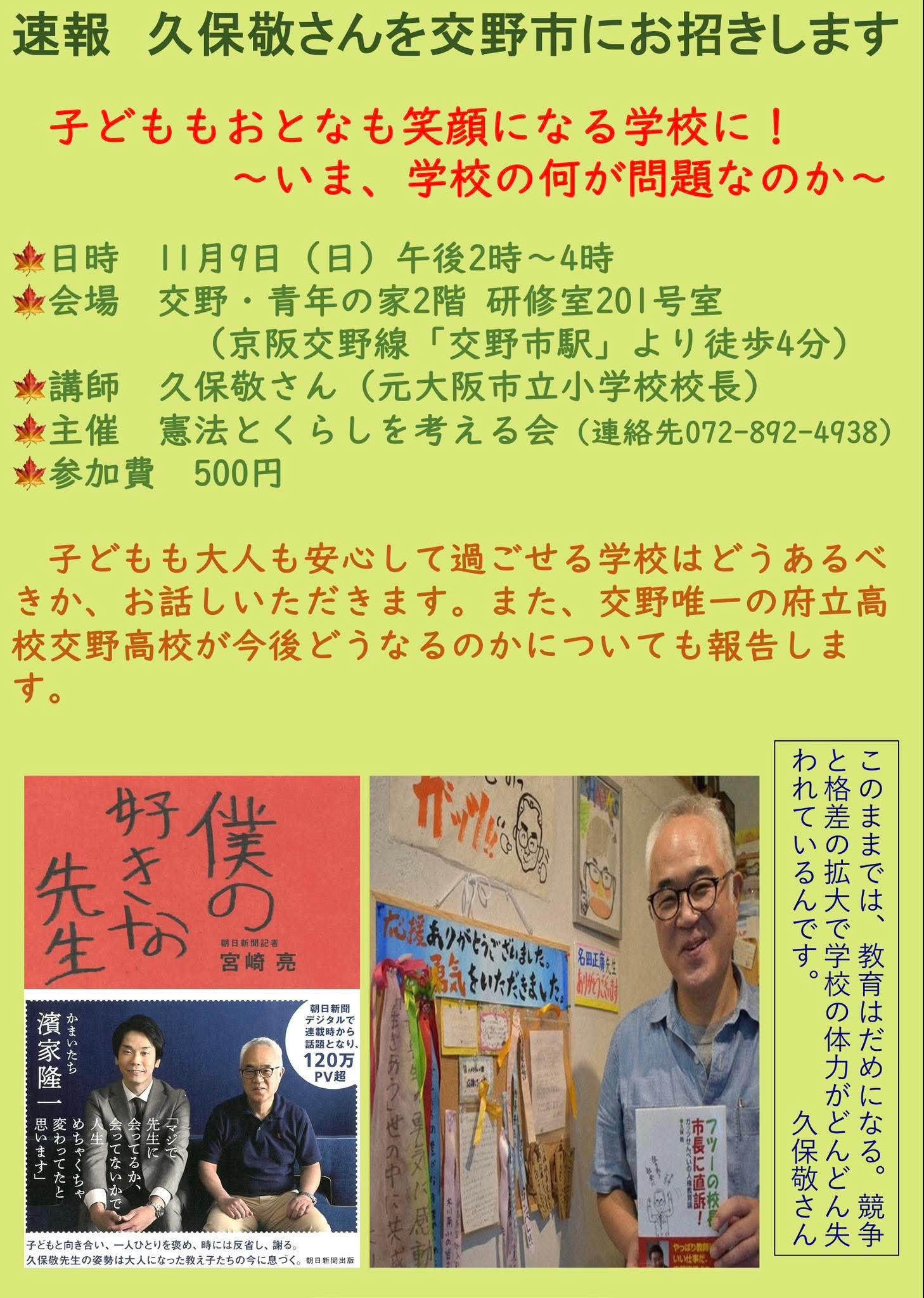 13:30~ 丹後文化会館 共催:米軍基地反対丹後連絡会 米軍基地建設を憂う宇川有志の会 ●子どももおとなも笑顔になる学校に! ~いま、学校の何が問題なのか~ 午後2時~4時 会場;交野・青年の家2階研修室201号室 講師:久保敬さん(元大阪市立小学校校長)参加費:500円 主催:憲法とくらしを考える会 ●治安維持法100年を考える奈良県のつどい 14:00開会 生駒市子ミュニティセンター ミニコンサート:一二三礼さん 記念講演:渡辺 治さん(一橋大学名誉教授)「治安維持法と現代社会」(仮題) 資料代:1,000円(学生・障がい者割引有) 主催:治安維持法100年を考える奈良県民の会 ●やんばる世界自然遺産展 9:00-17:00 場所:日本基督教団 東梅田教会 2階 201号室 入場無料 主催:同実行委員会 ●袖すり合うも集い処はな うたえ!うたえ!おどれ! 16時開演 会場:集い処はな(大阪メトロ堺筋線「動物園前駅」9番出口すぐ) 会場住所:大阪市西成区太子2-1-38 料金:投げ銭・要オーダー 出演:・カオリンズ・アカリトバリ・アシダケ |