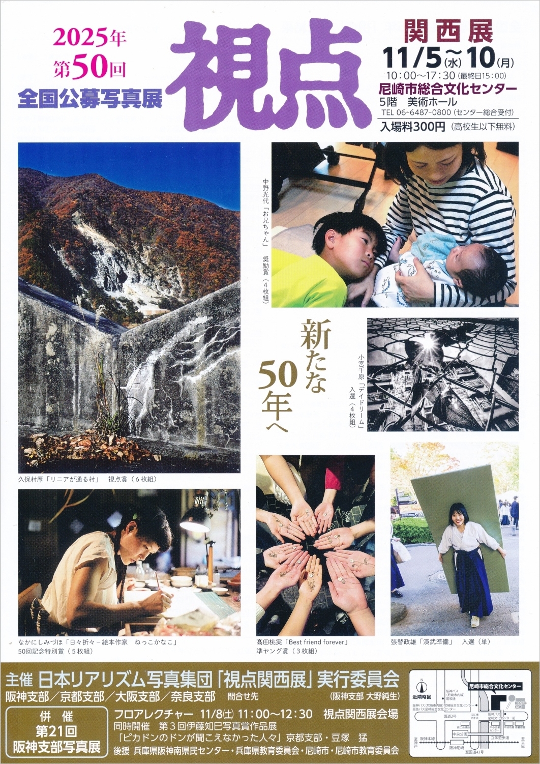 午後6時~午後8時(予定)開場午後5時30分 大阪弁護士会館10階1001・100会議室 Zoomウェビナー 第一部 基調講演 講師:根岸 陽太氏(西南学院大学 国際関係法学科 教授) 第二部 講師を交えての質疑応答 事前申し込み要 参加費無料 主催:大阪弁護士会、同 憲法問題特別委員会 ●2025年第50回 全国公募写真展視点 関西展 11月5日(水)-11月10日(月) 場所:尼崎市総合文化センター 5階 美術ホール 主催、問合せ先:日本リアリズム写真集団「視点関西展」実行委員会 |