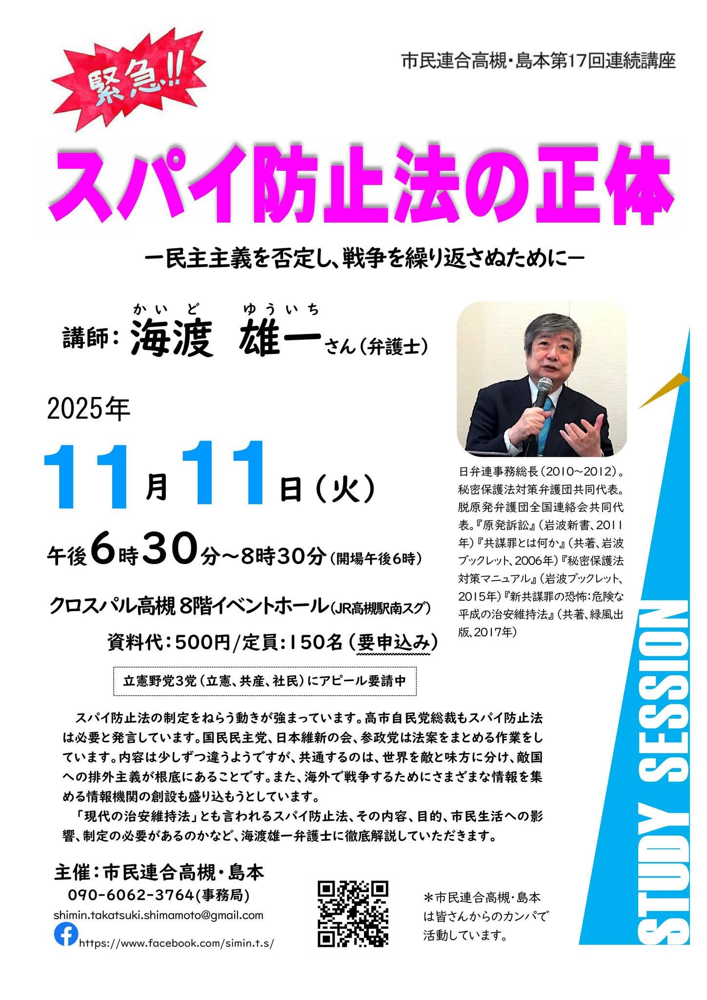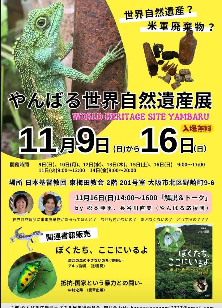 13:00-16:30 クレオ大阪東ホール モハマド・アローシュさん(PWSU委員長/PPSF) Zoom配信あり(事前予約要) チケット:一般(前売)1000円(当日1200円)その他(前売)500円(当日600円) 主催:ZENKO ●自分らしい豊かな暮らしのために 知っておきたい 成年後見制度の基礎知識 14:00~16:00(13:30受付) 会場:ドーンセンター5Fセミナー室① 講師:光山 幸さん(司法書士・社会保険労務士) 参加費:会員500円 会員外1000円 要事前申し込み 主催:高齢社会をよくする女性の会・大阪 ●やんばる世界自然遺産展 9:00-17:00 場所:日本基督教団 東梅田教会 2階 201号室 14:00~16:00 「解説&トーク」by松本亜季、長谷川直美(やんばる応援団) 入場無料 主催:同実行委員会 ●学習討論会「参政党」って何? 午後2時~4時半 場所:豊中市立住まい情報センターくらしかん 3階体験学習室 講演:「参政党」を知る 講師:二木洋子さん(市民連合高槻・島本呼びかけ人) 報告①「スパイ防止法」とは 藤木邦顕弁護士 報告②「外国人土地取得規制」で見えてきた排外主義 木村真豊中市議会議員 主催:立憲主義の回復と安保法制の廃止を求める市民連合豊中・池田 |