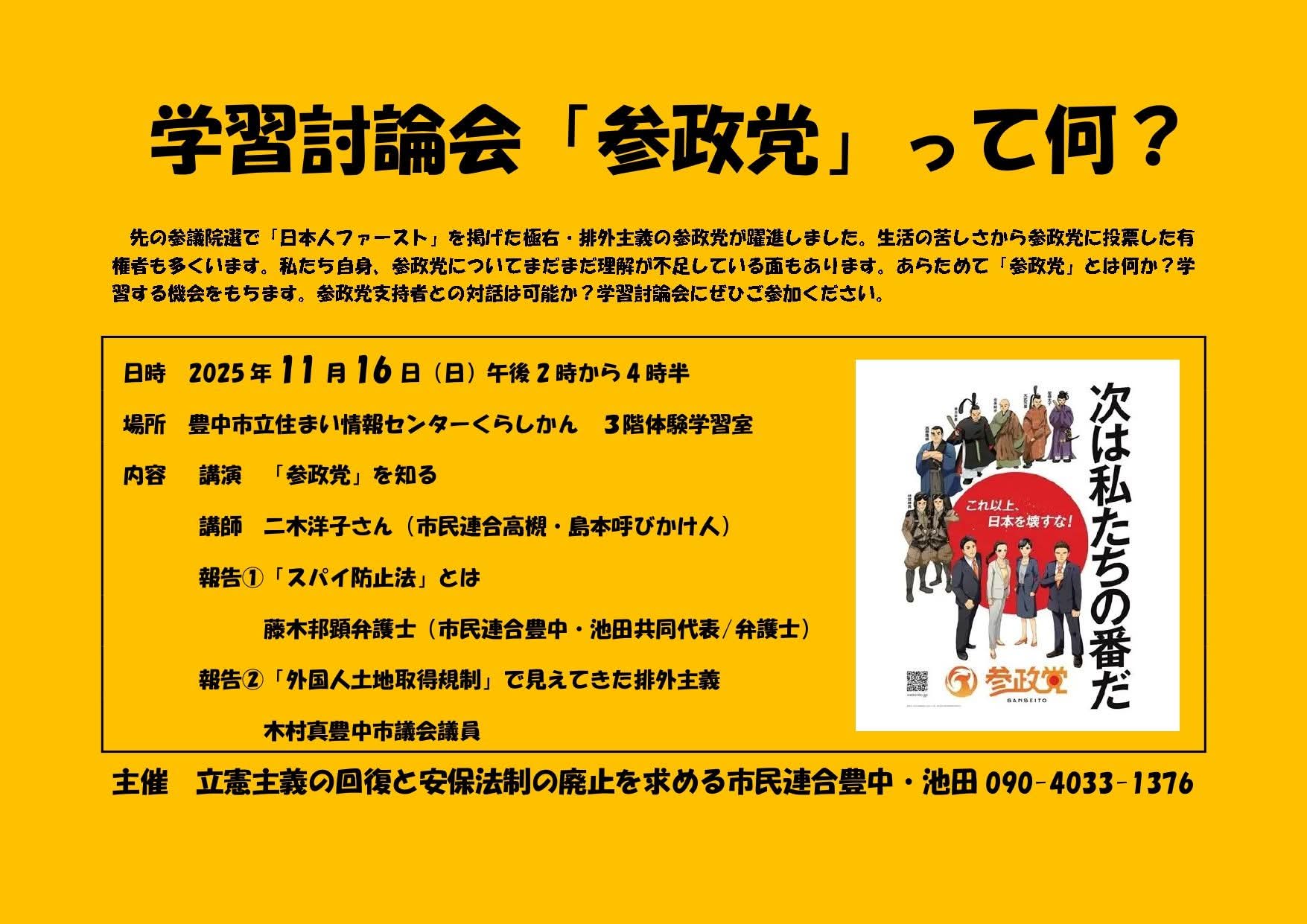 13:30~17:00 於:京都経済センター 講演のほか、小山優さんと対談 参加費:無料 注)講演会終了後に交流会を開催 ぞの参加費は3000円(事前申し込み制) 主催:京都・市民・オンブズパースン委員会 ●「憲法9条の会・関西」総会と講演会 総会 14時~ 講演会 14時20分~ 場所:摂津市コミュニティプラザ 2階 第3・4会議室 講演:「憲法草案から見る参政党の正体」 講師 澤野義一(当会代表)参加費:800円(学生 500円) 主催:「憲法9条の会・関西」 ●世界で台頭する極右ポピュリスト勢力 ~リベラル派はどう対抗すべきか~ 13時30分から15時30分まで(13時開場) 場所:平野市民センター2階第1会議室 講師:木戸 衛一さん 参加協力費:1000円 主催:戦争をさせない1000人委員会・しが |