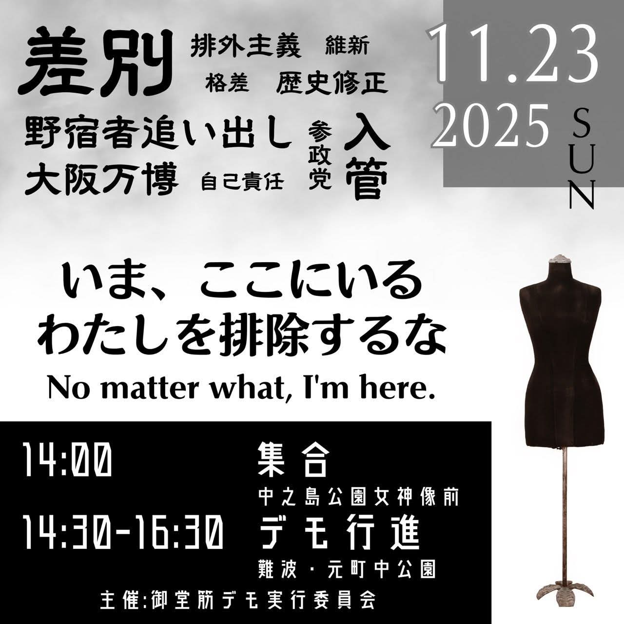 13:40 OPENING LIVE 一二三 礼さん 14:00 MAIN SPEECH 高山 佳奈子さん(京都大学教授) @中之島公園女性像前 主催:おおさか総がかり行動実行委員会 ●2025 生かそう憲法守ろう9条 11・3 憲法集会IN京都 13:30スタート(開場12:30)円山公園音楽堂 講演:高橋純子さん(ジャーナリスト・朝日新聞編集委員)「戦後・被爆80年 戦争しない させない 憲法生かして平和をつくる」 公演:京都鬼剣舞(民俗芸能) 雨天決行 手話通訳あり 憲法ウォーク 15時15分頃 京都市役所前まで 主催:憲法9条京都の会/9条改憲NO!全国市民アクション・京都 ●九州訴訟判決前 関西訴訟結審前 合同集会 13:45~17:00(13:15開場)大阪会場:エル・おおさか606号室 ZOOM配信あり(事前申し込み要) 主催:福島原発事故被害者救済九州訴訟原告団・弁護団・ふくQ 原発賠償関西訴訟原告団・弁護団・KANSAIサポーターズ ●連続市民講座③生活保護基準引き下げに違憲判決 最高裁判決の意義を広めよう 14:00~ 東園田町総合会館 講演:和田信也弁護士 会場費:500円 主催:市民の力で社会を変えよう!連続市民講座 ●憲法記念日にみんなで歩こう!市民パレードINとよなか 10:30~12:00(雨天決行) 10:30豊中市役所前広場集合 10:35~ミニ集会 11:00~パレード出発(阪急豊中駅まで) 主催:市民パレードINとよなか実行委員会 ●第20回なら憲法まつり 10:00~16:00 JR奈良駅前広場 小雨決行 平和のライブ 川口真由美、カオリンズ 他 主催:同実行委員会 ●ガザ虐殺やめろ!即時恒久停戦!堺市民アクション 午後6時ー7時 堺東と中百舌鳥 駅前スタンディング |