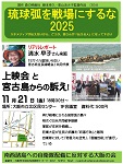2025年 11月21日(金) 18:30~(18:00開場)北区民センター1F会議室 宮古島から 清水早子さん 来阪!! リアルレポート 資料代:500円 主催:南西諸島への自衛隊配備に反対する大阪の会 |