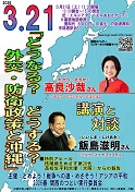 2026年 3月21日(土) 13:30開場 13:50開会 15:45閉会 会場:エルシアター(エルおおさか2F) 講演と対談: 飯島滋明さん(名古屋学院大学経済学部教授) 高良沙哉さん(沖縄大学人文学部教授 参議院議員) 「どうなる? どうする? 外交・防衛政策と沖縄」 特別アピール:核廃絶をめざす第28代高校生平和大使(大阪)からの報告 資料代:500円(中高生・介助者無料) 手話通訳あり 主催:とめよう!戦争への道・めざそう!アジアの平和 2026春 関西のつどい実行委員会 呼びかけ:大阪平和人権センター/しないさせない戦争協力関西ネットワーク/戦争をさせない1000 人委員会・大阪 |