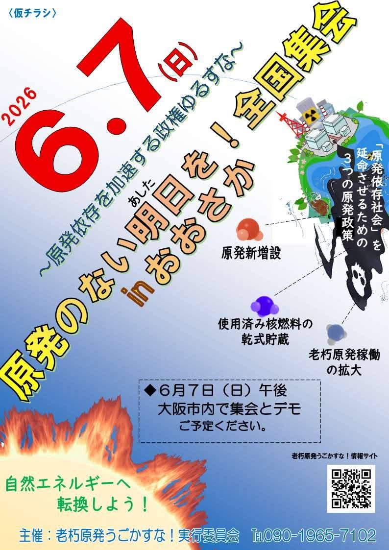 2026年 6月7日(日) 午後 大阪市内で集会とデモ 主催:老朽原発うごかすな!実行委員会 |